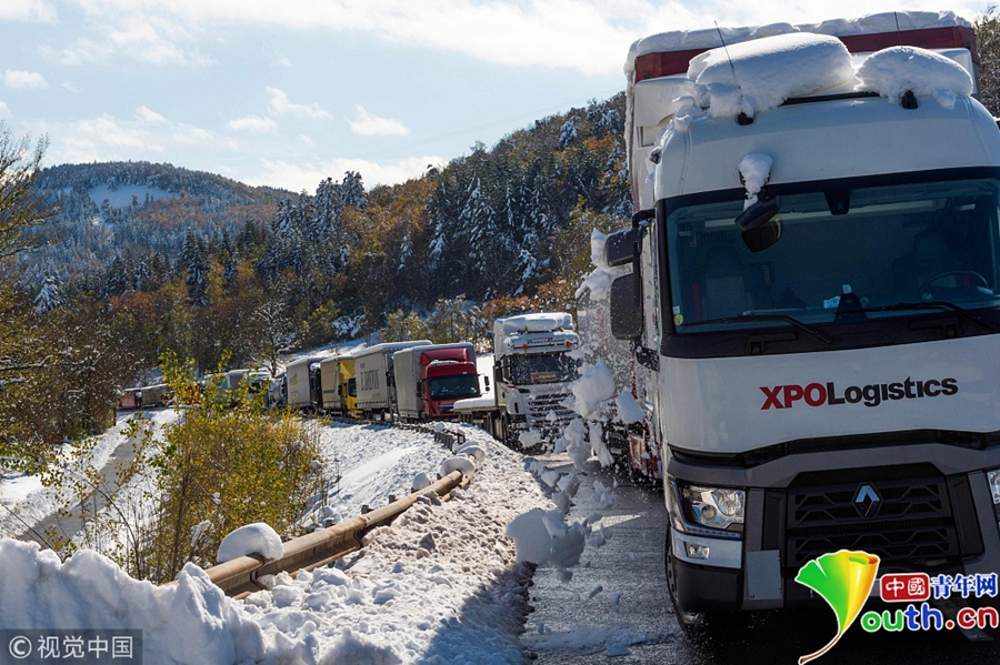 當(dāng)?shù)貢r(shí)間2018年10月30日,法國(guó)菲克斯圣熱內(nèi),當(dāng)?shù)赝唤荡笱?,?dǎo)致950人被困在大雪覆蓋的公路上,不得不睡在緊急救援中心。法國(guó)國(guó)家氣象局已經(jīng)將當(dāng)?shù)刂糜诔壬踩渲隆?/p>