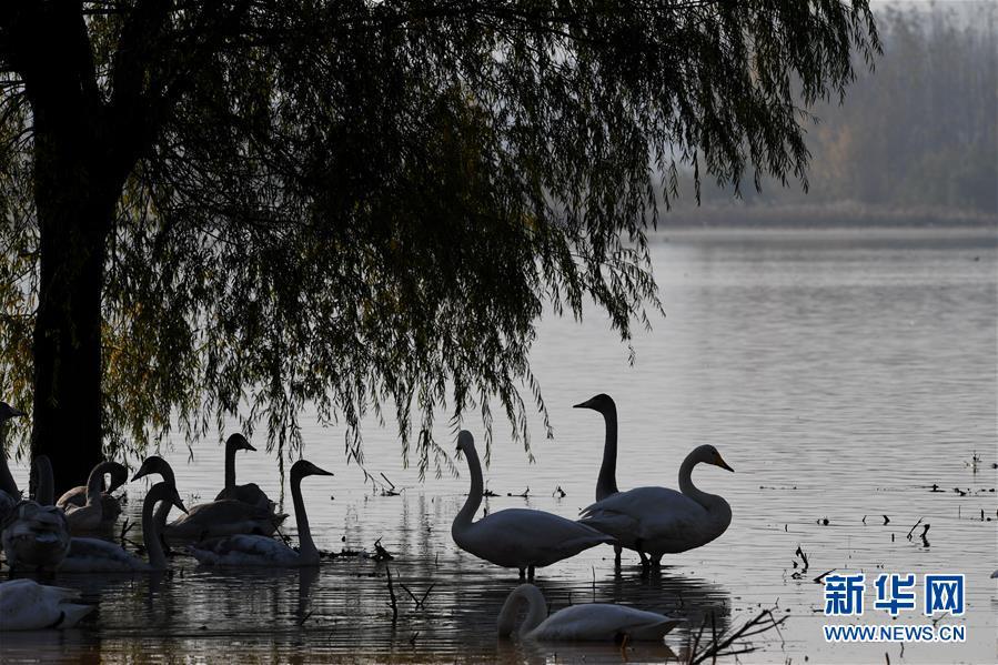 10月31日,大天鵝在山西平陸黃河濕地覓食。新華社記者 楊晨光 攝