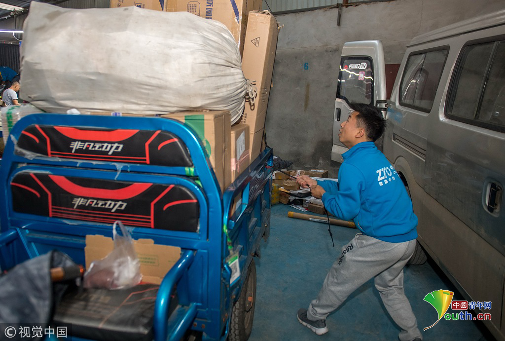 2018年10月16日,攝影師實(shí)拍90后快遞員熊忠桃的一天工作。圖片作者:銳圖