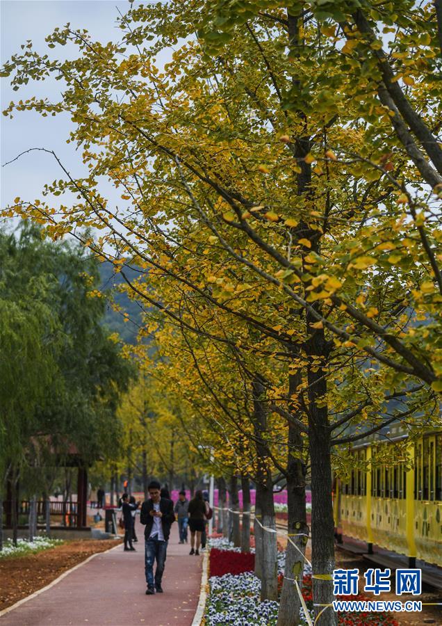 11月2日,游客在金黃的銀杏林與“五彩花?!遍g觀賞秋色。 新華社記者 徐昱 攝