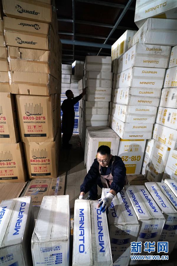 11月3日,貴溪市美納途箱包公司的工作人員在為“雙十一”購物節(jié)備貨。