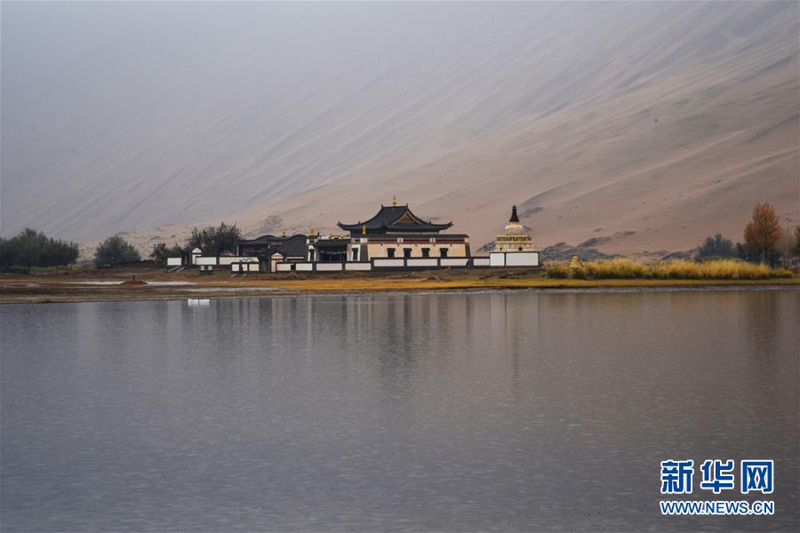 巴丹吉林廟位于名為“廟海子”的湖泊旁(10月19日攝)。 巴丹吉林沙漠位于內(nèi)蒙古西部阿拉善盟,是中國(guó)第三大沙漠,沙丘起伏的曲線陡變成高聳的沙山,碧藍(lán)的湖泊散落在沙海間。 新華社記者 李仁虎 攝