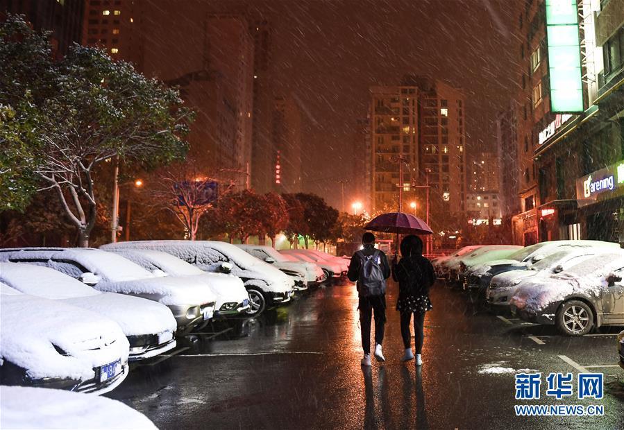 在青海省西寧市,兩名市民冒雪前行(11月3日攝)。 11月3日,青海省西寧市等地迎來降雪。 新華社記者 吳剛 攝