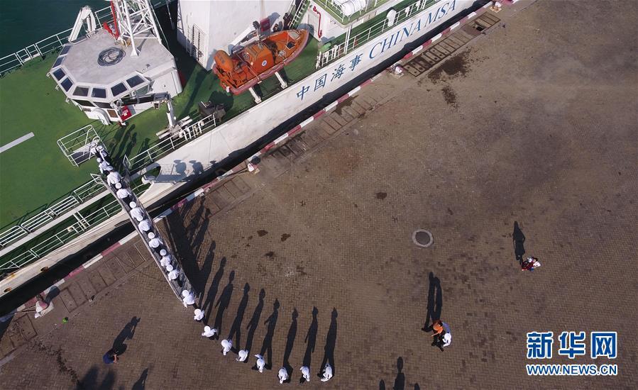11月3日,海事執(zhí)法人員準備登上“海巡21”輪(無人機拍攝)。 當日,隨著“海巡21”輪緩緩駛離??诤J卤O(jiān)管基地碼頭,由瓊桂粵海事部門共同開展的瓊州海峽、北部灣及環(huán)海南島水域跨轄區(qū)聯(lián)合巡航執(zhí)法活動揭開序幕。 新華社記者楊冠宇攝