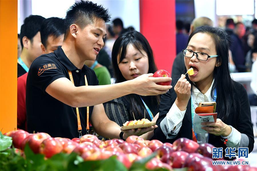 11月7日,好果云公司的工作人員(左)為參觀者介紹從美國(guó)進(jìn)口的一款蘋(píng)果。