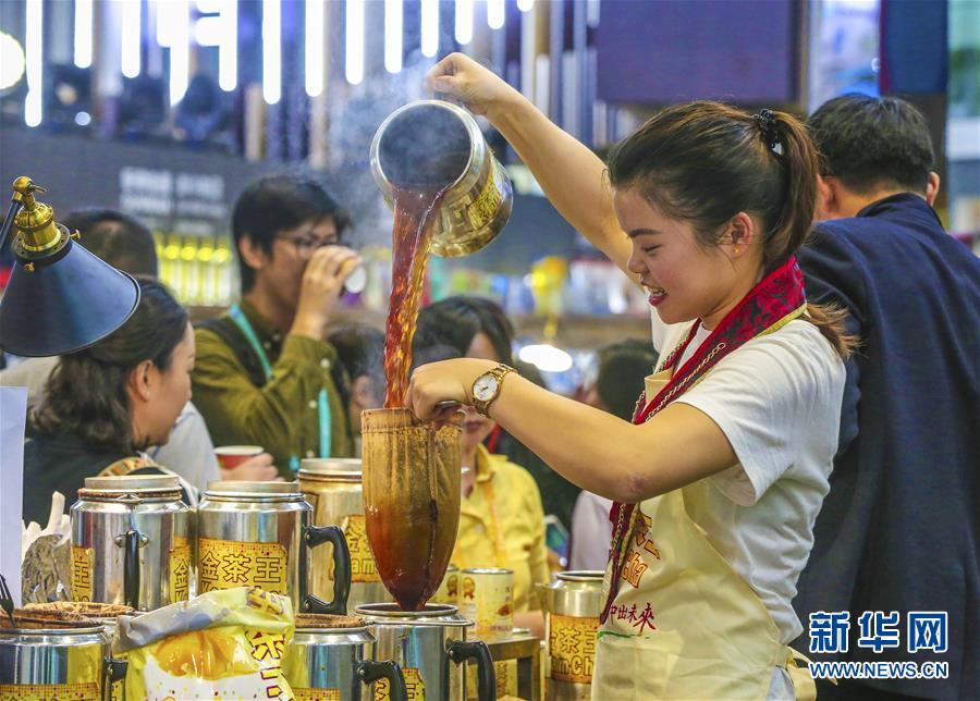 11月7日,在進(jìn)博會食品及農(nóng)產(chǎn)品展區(qū),參展人員制作“金茶王”港式奶茶。 新華社記者 殷剛 攝