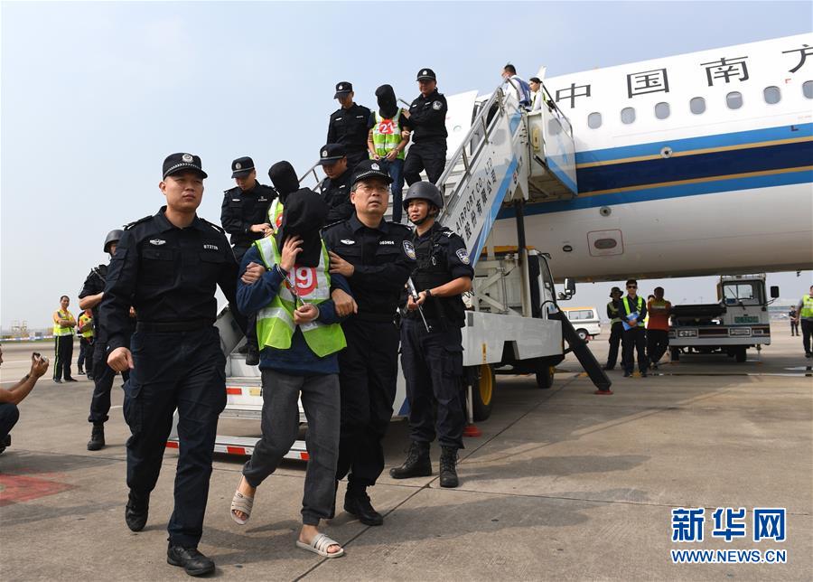 11月7日,在深圳寶安機(jī)場(chǎng),民警押解犯罪嫌疑人下機(jī)。新華社記者毛思倩攝