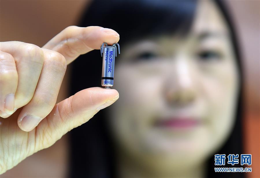 11月8日,在進(jìn)博會(huì)醫(yī)療器械及醫(yī)藥保健展區(qū)美敦力公司展臺,工作人員在展示全球最小的心臟起搏器。新華社記者 韓瑜慶 攝