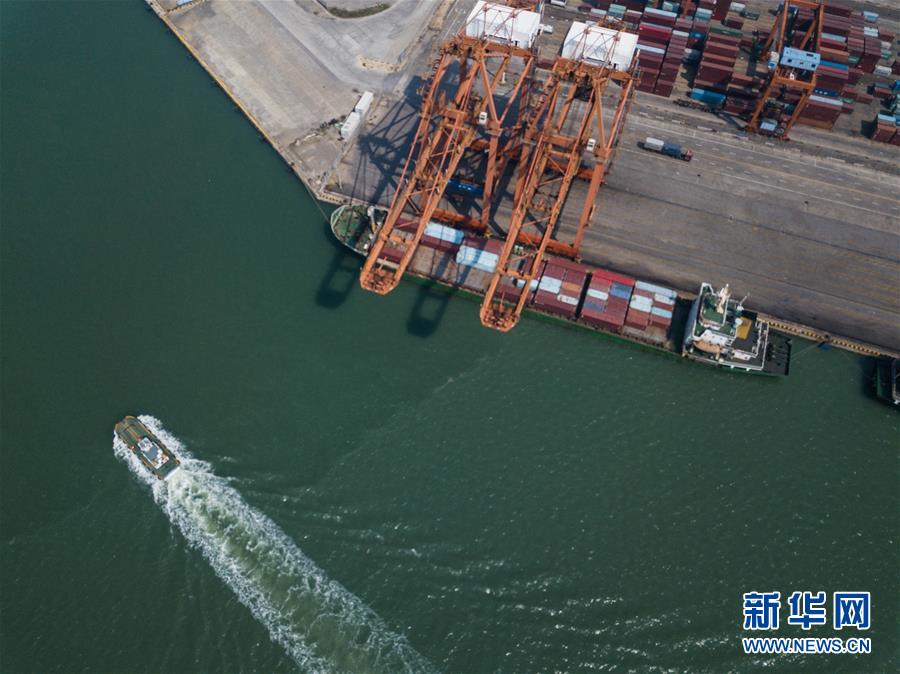 一艘海輪停泊在廣西欽州保稅港區(qū)碼頭裝運貨物(11月3日無人機拍攝)。