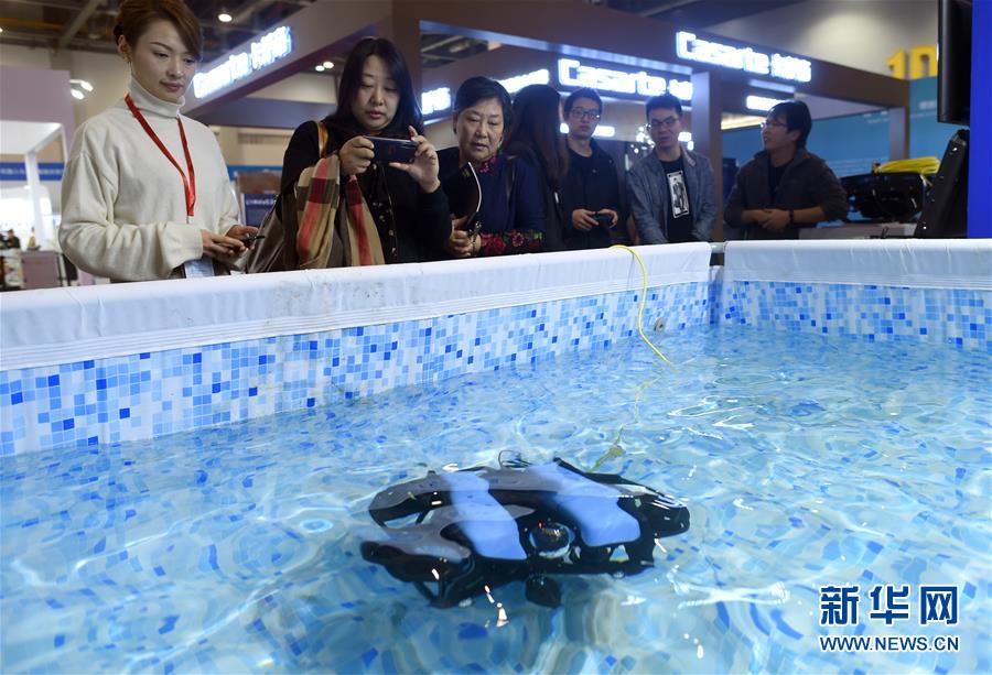 11月10日,人們在展會現(xiàn)場觀看展出的一款小型水下機(jī)器人。 新華社記者韓傳號攝