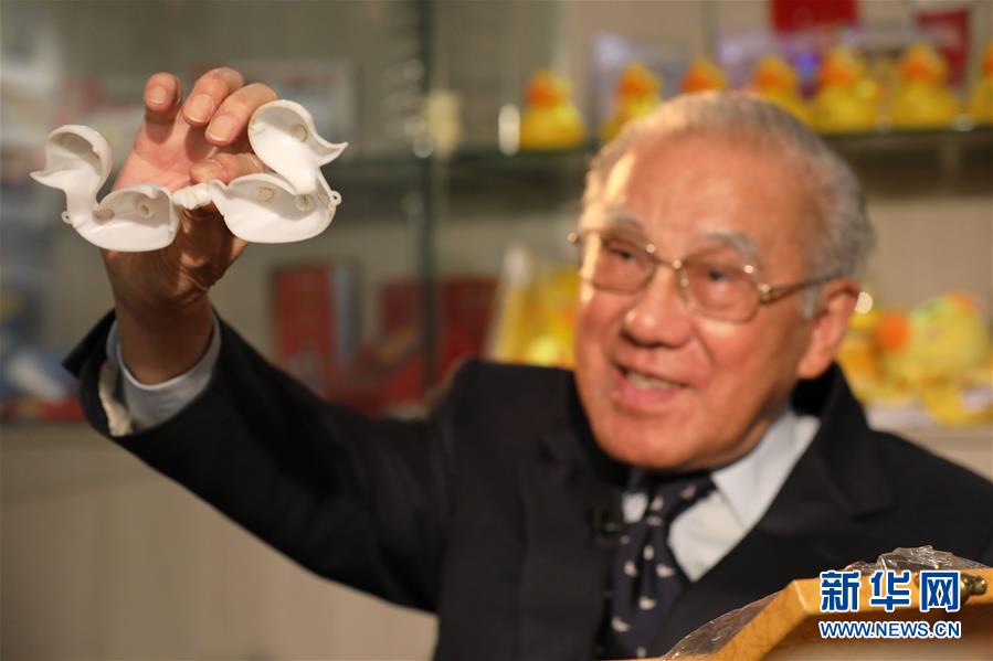 林亮在展示當(dāng)年生產(chǎn)小黃鴨的模具(10月26日攝)。