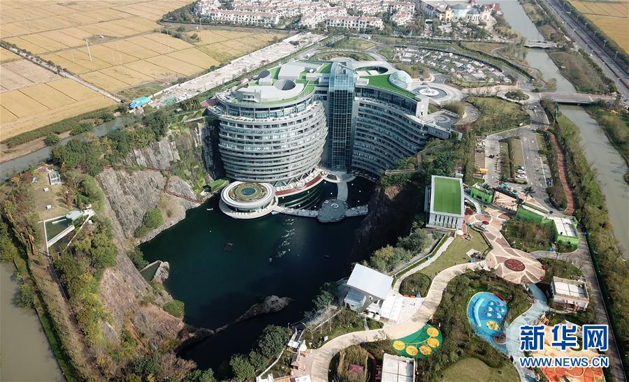 這是位于上海松江佘山腳下的世茂洲際酒店(11月13日無人機(jī)拍攝)。 位于上海松江的世茂洲際酒店11月15日正式開門營業(yè)。這家在一個廢棄采石礦坑內(nèi)建成的酒店成為上海又一新景。 新華社記者 方喆 攝