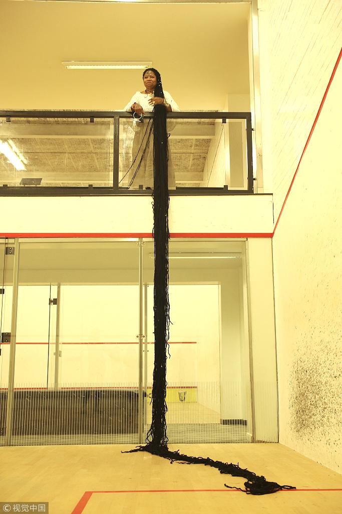當(dāng)?shù)貢r(shí)間2018年9月14日,英國(guó)韋靈伯勒,正在英國(guó)旅行的Asha Mandela來(lái)自美國(guó)佛羅里達(dá)州,是世界上頭發(fā)最長(zhǎng)的女人。
