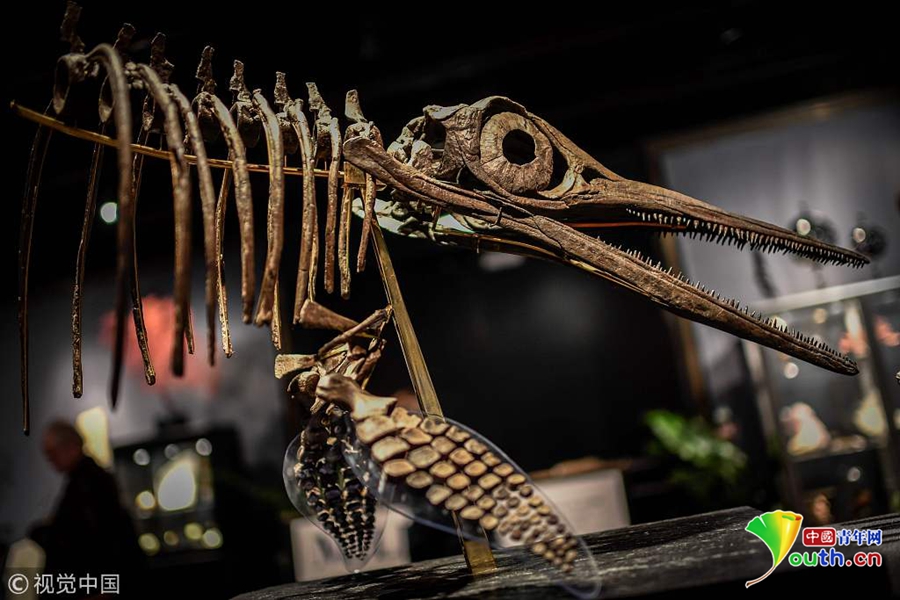 當(dāng)?shù)貢r(shí)間2018年11月19日,法國(guó)巴黎,在展出中的1.8億年前侏羅紀(jì)時(shí)期的恐龍骨架,將于11月20日在Drouot拍賣行拍賣。圖片來源:視覺中國(guó)