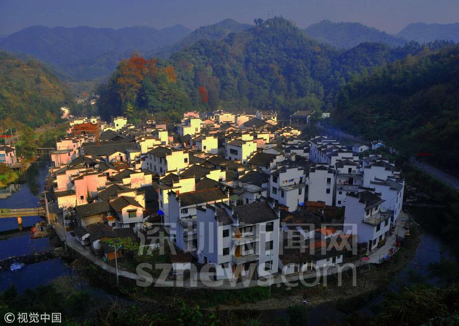 小河呈大半圓形,繞村莊將近一周,四周高山環(huán)繞,新修的柏油公路沿著河流呈圓弧形繞村而過,一些木板橋與公路相連。