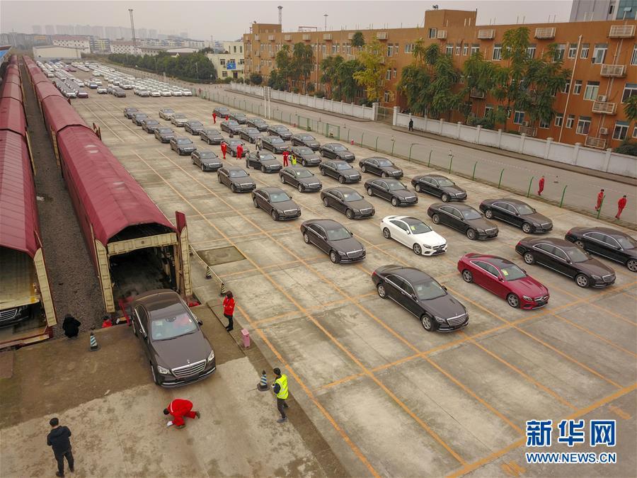 當(dāng)日,首趟中歐班列商品車(chē)專(zhuān)用車(chē)運(yùn)輸國(guó)際班列搭載的112臺(tái)奔馳品牌進(jìn)口整車(chē)在重慶順利完成通關(guān)。