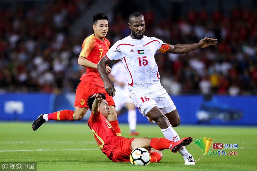 2018年11月20日,海口,2018國(guó)際足球友誼賽,中國(guó)男足Vs巴勒斯坦。郜林拼搶 圖片作者:null