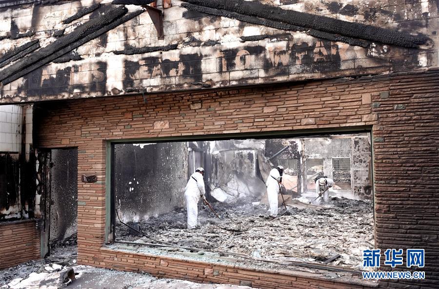 11月20日,在美國加利福尼亞州比尤特縣天堂鎮(zhèn),救援人員在山火廢墟中工作。