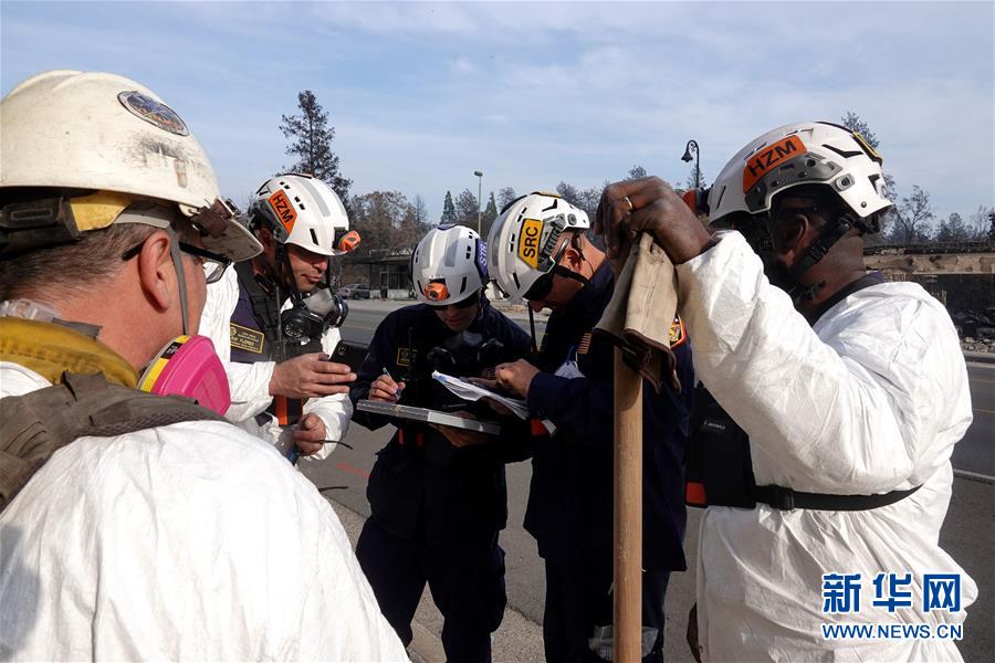11月20日,在美國加利福尼亞州比尤特縣天堂鎮(zhèn),救援人員在災(zāi)區(qū)工作。