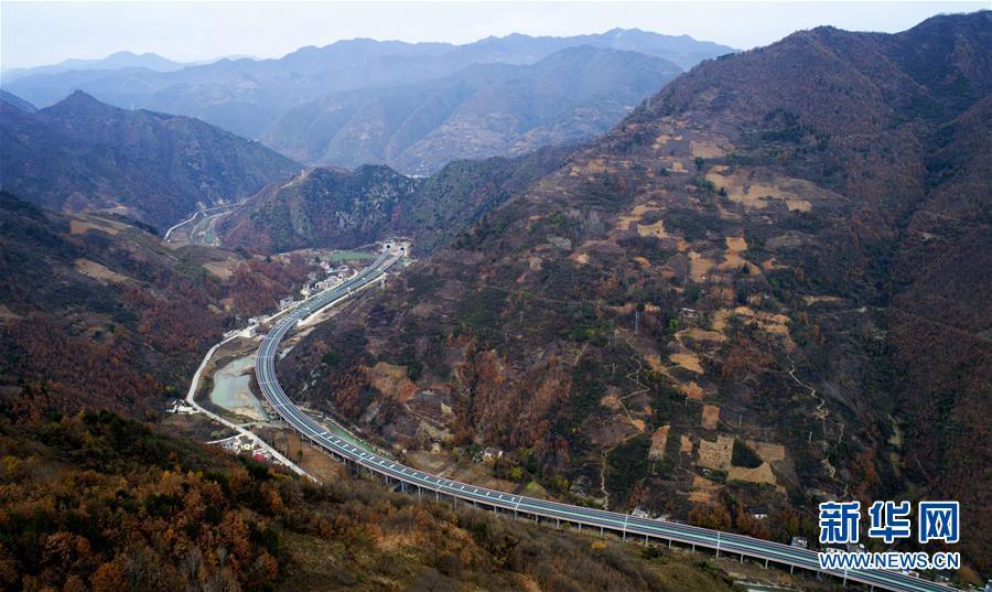 11月20日拍攝的水陽高速公路與福銀高速公路相接的樞紐互通式立交(無人機拍攝)。 近日,記者從陜西省交通建設(shè)集團公司了解到,陜西柞水至山陽高速公路已全線貫通即將通車。據(jù)介紹,(柞)水(山)陽高速公路全長78.8公里,開通后將實現(xiàn)包茂高速、福銀高速在陜南商洛地區(qū)的連接,開辟出秦嶺南麓的一條橫向高速大通道,對完善陜西高速公路路網(wǎng)結(jié)構(gòu)、促進陜南區(qū)域經(jīng)濟發(fā)展、加快山區(qū)群眾脫貧致富具有重要意義。 新華社記者劉瀟攝