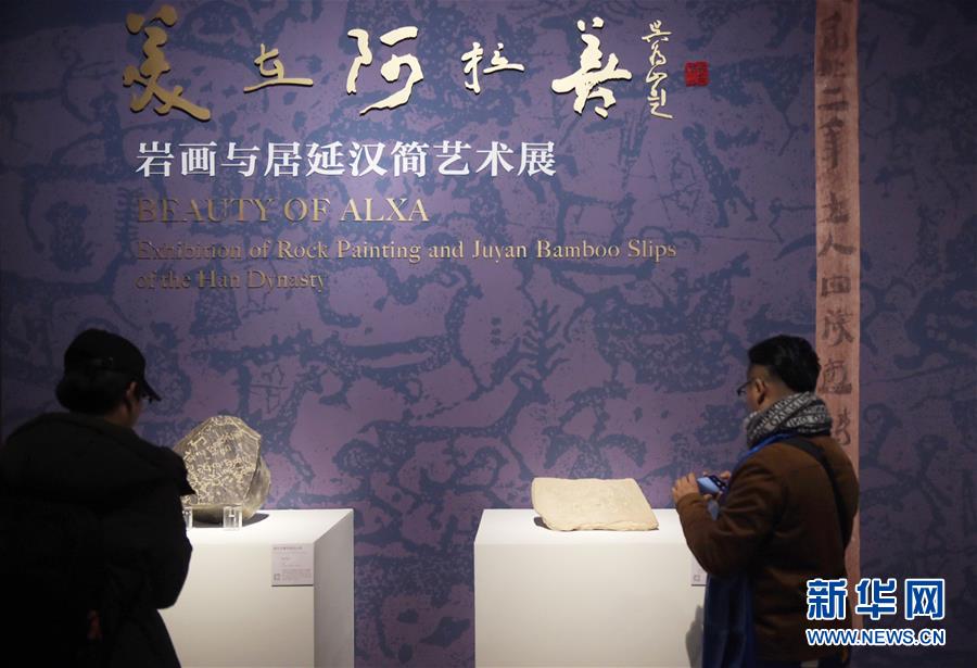 當(dāng)日,“美在阿拉善——巖畫(huà)與居延漢簡(jiǎn)藝術(shù)展”在北京中國(guó)美術(shù)館開(kāi)幕,共展出巖畫(huà)實(shí)物、雕塑、拓片、漢簡(jiǎn)等共計(jì)100多件。 新華社記者 魯鵬 攝