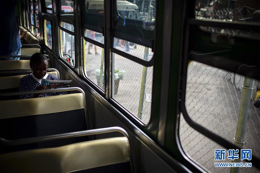 10月7日,在美國紐約舉行的巴士節(jié)上,一名女子在3100號巴士上看報。該車型是美國首批配備空調(diào)的巴士車型之一。 新華社記者李木子攝