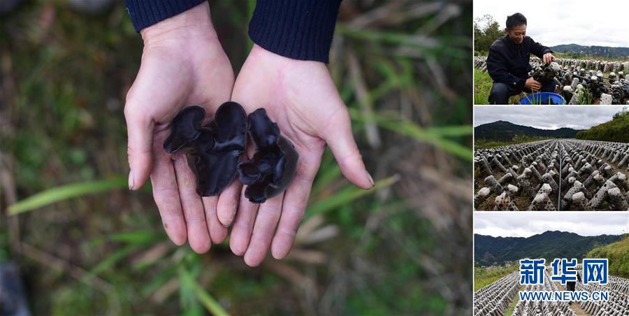 拼版照片:左圖為在大浪鎮(zhèn)上里村,致富帶頭人唐志海手捧剛剛收獲的木耳;右上圖為唐志海在木耳種植基地里采摘木耳;右中圖為木耳種植基地;右下圖為唐志海在木耳種植基地里查看木耳長勢(照片均攝于11月18日)。近年來,上里村依靠發(fā)展紅薯、木耳種植,已于2016年實現(xiàn)脫貧。 廣西融水苗族自治縣是國家扶貧工作重點縣,全縣“九山半水半分田”,生活生產(chǎn)環(huán)境較為惡劣,脫貧攻堅任務艱巨,目前還有7.68萬貧困人口。面對經(jīng)濟發(fā)展落后、貧困面廣且程度深的現(xiàn)狀,當?shù)匕衙撠毠耘c創(chuàng)新產(chǎn)業(yè)扶持相結(jié)合,依托生態(tài)資源優(yōu)勢,實施“特色產(chǎn)業(yè)富民行動”,通過發(fā)展特色民族旅游、林下經(jīng)濟和特色養(yǎng)殖業(yè)等扶貧產(chǎn)業(yè),帶動貧困群眾依靠勤勞的雙手,拔窮根摘窮帽,實現(xiàn)脫貧致富。據(jù)了解,目前全縣貧困戶參與特色產(chǎn)業(yè)發(fā)展的有2.9萬戶,扶貧產(chǎn)業(yè)覆蓋率達95%。 新華社記者 黃孝邦 攝
