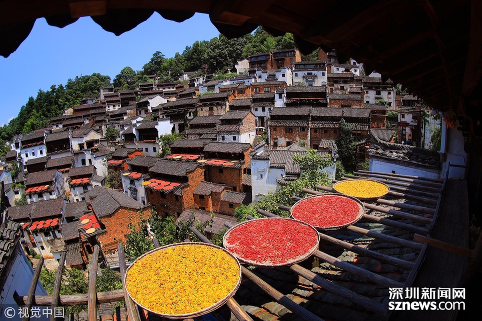 2018年8月7日,江西婺源縣篁嶺古村,壯觀的“曬秋”場景。 深圳新聞網(wǎng)訊 2018年8月7日,江西婺源縣篁嶺古村落,壯觀“曬秋”場景。當(dāng)日立秋節(jié)氣,江西婺源縣篁嶺古村的農(nóng)作物普遍豐收,村民們又迎來了一年一度的“曬秋”季。村民們將收獲來的紅辣椒、玉米、南瓜、稻谷和菊花等色彩斑斕的農(nóng)作物,晾曬在依山而建的徽派民居房前屋后的木制曬架上,在秋日陽光的照射下,色彩繽紛圓圓的曬扁,鋪就在錯(cuò)落有致的徽派民居之間,格外璀璨奪目,蔚為壯觀。目前,“篁嶺曬秋”已經(jīng)成為中國鄉(xiāng)村旅游的一張名片。