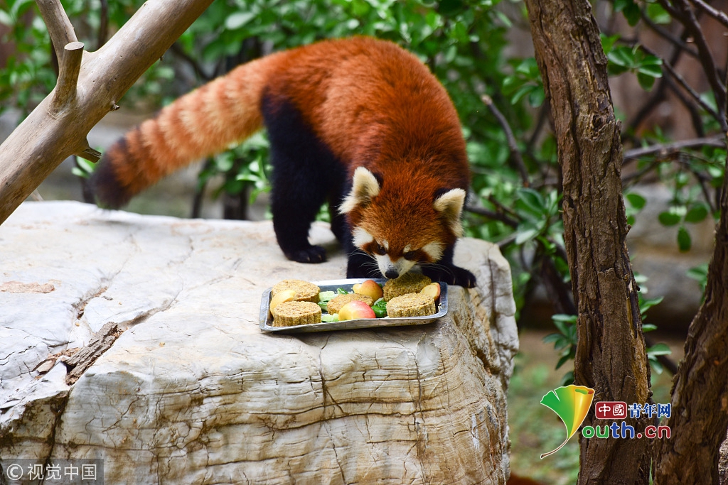 2016年09月15日,在山東煙臺(tái)動(dòng)物園,一只小熊貓?jiān)诔蕴刂频乃霸嘛灐薄?/p>