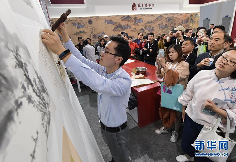 11月23日,參觀者(左一)在中國文字博物館展臺(tái)前體驗(yàn)?zāi)镜癜嬗∷⒐に嚒P氯A社記者李賀攝