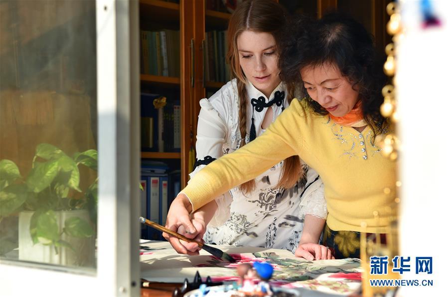 11月24日,在石家莊橋西區(qū)家中,艾米莉跟婆婆學(xué)習(xí)畫(huà)中國(guó)畫(huà)。 新華社發(fā)(張曉峰 攝)