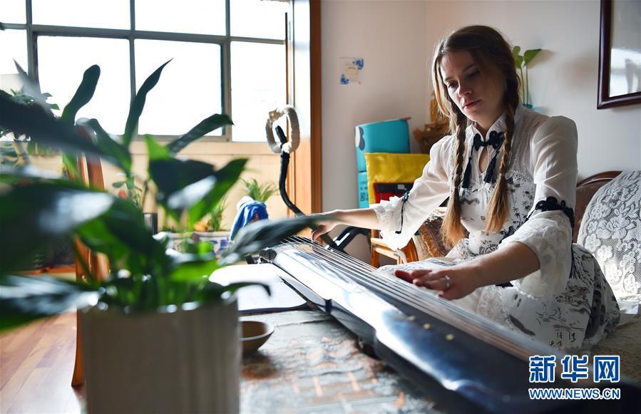 11月24日,在石家莊橋西區(qū)家中,艾米莉在練習(xí)彈古琴。 新華社發(fā)(張曉峰 攝)