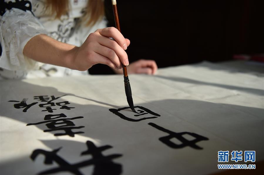 11月24日,在石家莊橋西區(qū)家中,艾米莉在練習(xí)書法。 新華社發(fā)(張曉峰 攝)