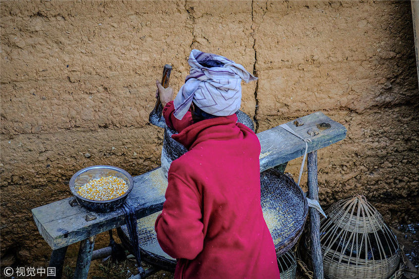 2018年11月,云南昆明。潘志仙在手工磨面。
