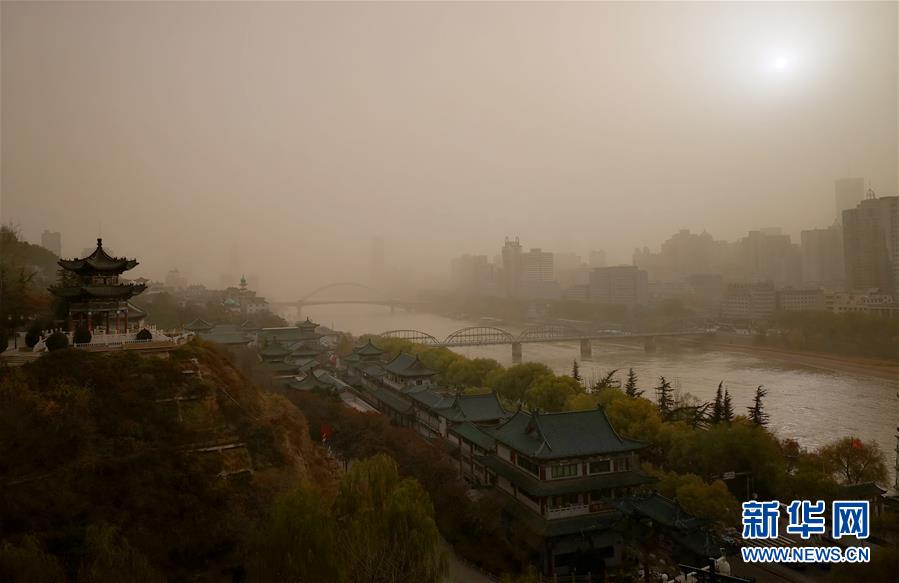 11月26日,在黃河蘭州段沿岸,市民在浮塵天氣中出行。 新華社記者 范培珅 攝