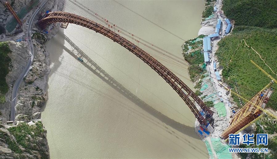 9月28日拍攝的川藏鐵路拉林段重點標志性工程藏木特大橋。 當日,隨著最后一節(jié)鋼管拱的對位和鎖定完畢,川藏鐵路拉林段藏木特大橋成功合龍,標志著大橋主體結構施工取得了關鍵性勝利。藏木特大橋由中國中鐵廣州局集團承建,拱高112米,橋橫跨雅魯藏布江峽谷,水深66米。 新華社記者普布扎西攝