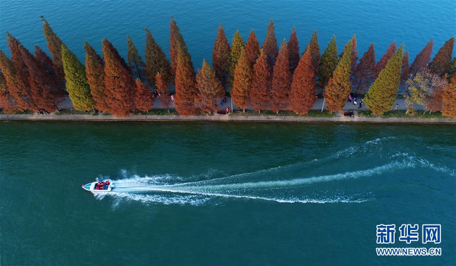 一艘游艇在湖南烈士公園年嘉湖湖面行駛(11月25日無人機(jī)拍攝)。新華社記者 李尕攝