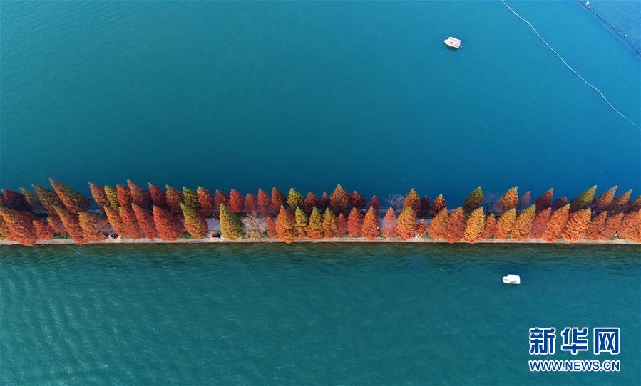 兩只小船行駛在湖南烈士公園年嘉湖湖面(11月25日無(wú)人機(jī)拍攝)。新華社記者 李尕?cái)z