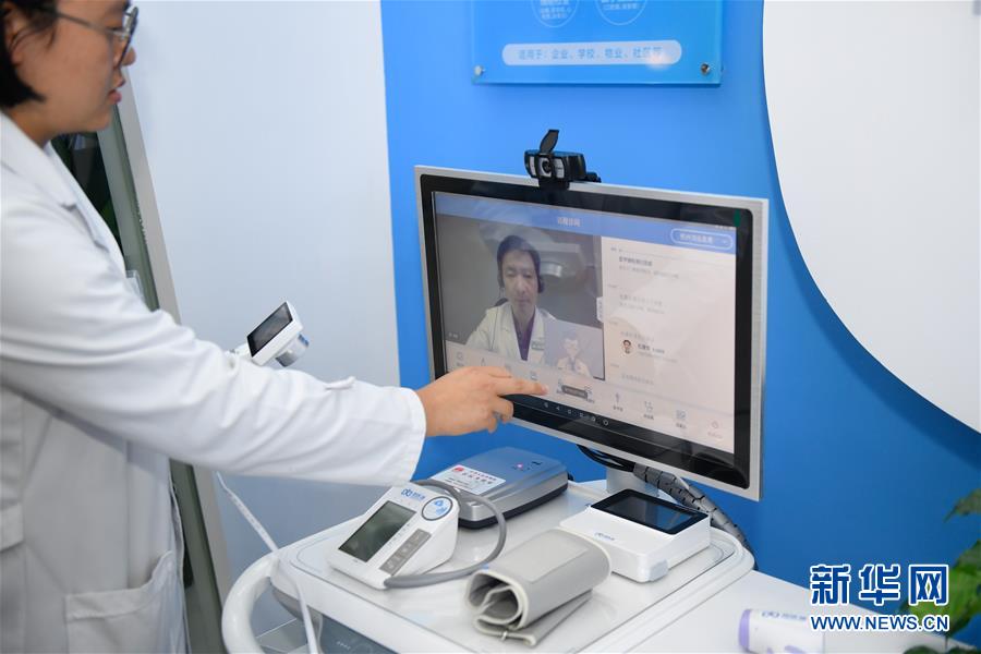 11月6日,烏鎮(zhèn)互聯(lián)網(wǎng)醫(yī)院的員工在操作“智能醫(yī)務(wù)室”與醫(yī)生的視頻連線功能。據(jù)了解,“智能醫(yī)務(wù)室”由智能移動醫(yī)療一體機、智能藥柜以及一系列檢查設(shè)備組成,根據(jù)健康檔案和檢查結(jié)果,視頻連接家庭醫(yī)生就能解決常見的醫(yī)療健康問題。 新華社記者黃宗治攝