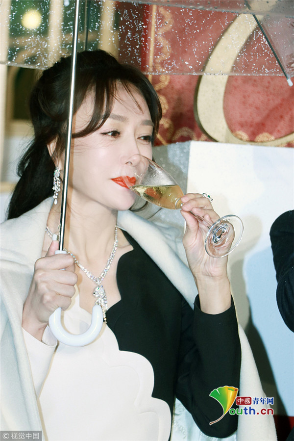 秦嵐撐傘雪膚紅唇美如畫(huà) 優(yōu)雅品香檳 ...