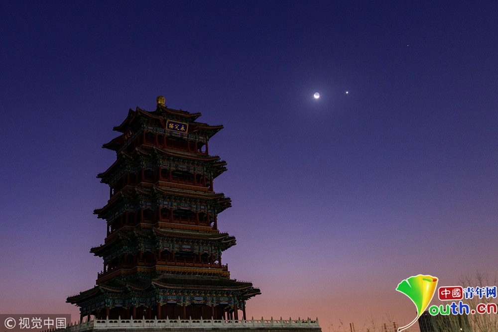 2018年12月4日,北京,金星合月天象。金星位于月亮以南3.6度左右的位置上。在這個(gè)時(shí)間附近,以肉眼從地面看去,金星與月亮的二維距離在夜空中看起來(lái)是比較接近的,但是在三維空間上,它們的距離是非常遙遠(yuǎn)的(大約6000萬(wàn)千米)。圖片來(lái)源:視覺(jué)中國(guó)