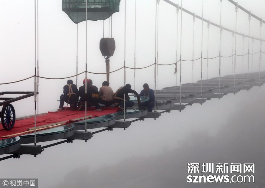 深圳新聞網(wǎng)訊 2018年12月3日,在浙江玉環(huán)市上棧頭玻璃吊橋建設工地上,工人們正在北端橋頭鋪設橋面4厘米厚的玻璃,預計46個箱梁的玻璃全部鋪設完成需到5日,然后再進入安裝兩側護欄和拉攀抗風拉索,吊橋工程竣工定于23日,準備在2019年元旦試運行。