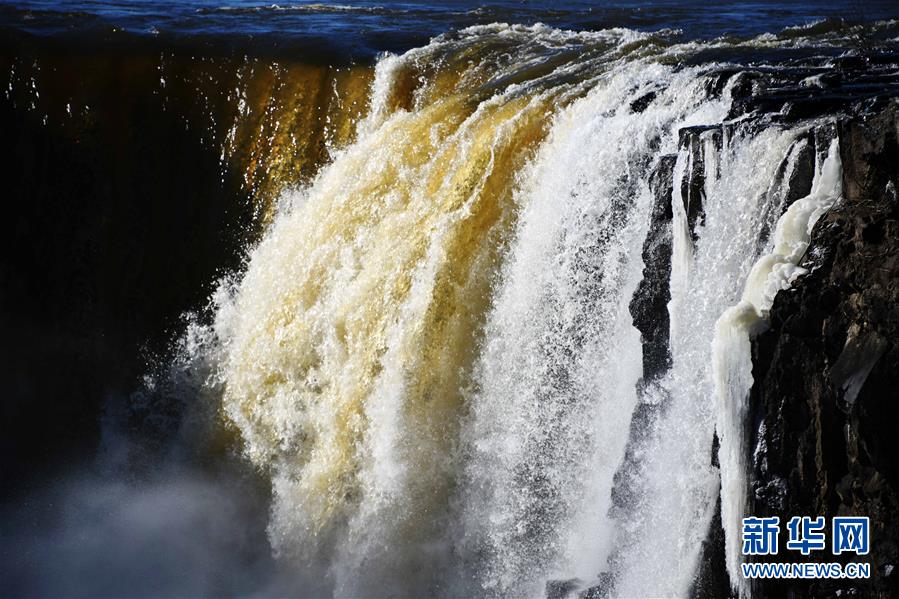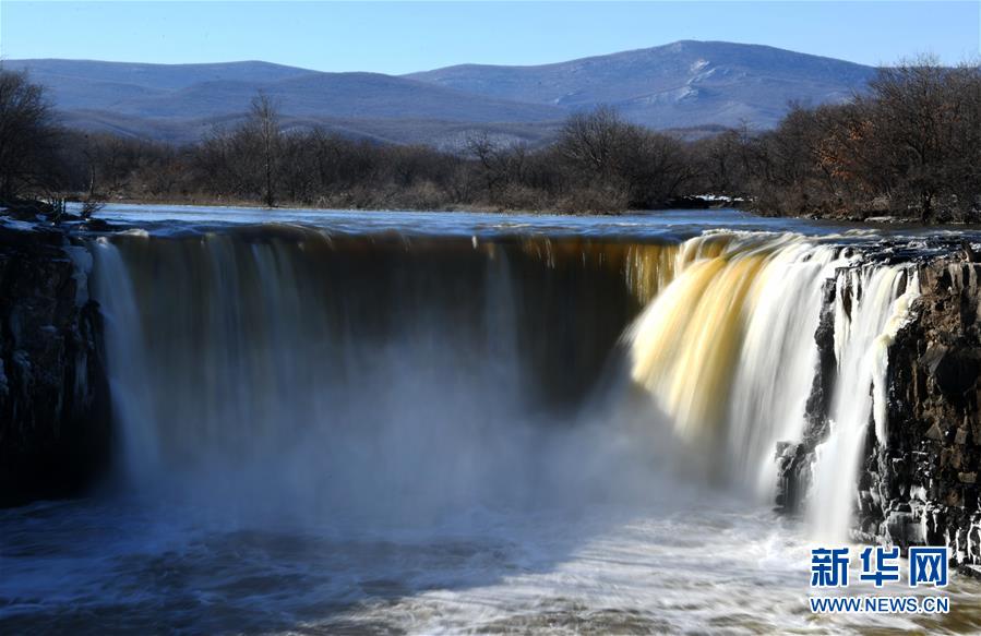 吊水樓瀑布的冬季飛瀑奇觀(12月5日攝)。 受上游來(lái)水量大和近期氣溫偏高等因素影響,位于黑龍江東南部的火山堰塞湖——鏡泊湖的吊水樓瀑布水量充沛,展現(xiàn)出飛流直下、水霧升騰的冬季奇觀,引來(lái)許多游人觀賞。 新華社記者王建威攝