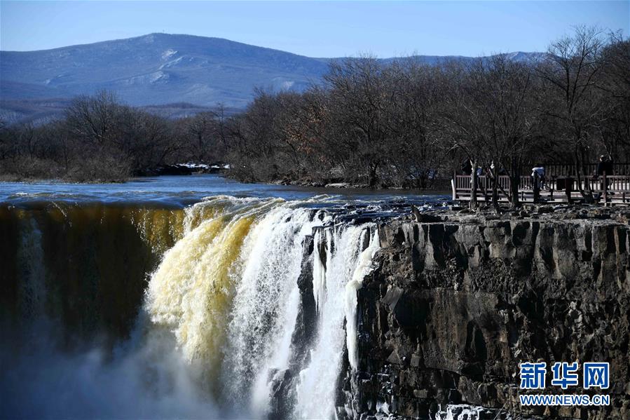 12月5日,游客在觀賞吊水樓瀑布。 受上游來(lái)水量大和近期氣溫偏高等因素影響,位于黑龍江東南部的火山堰塞湖——鏡泊湖的吊水樓瀑布水量充沛,展現(xiàn)出飛流直下、水霧升騰的冬季奇觀,引來(lái)許多游人觀賞。 新華社記者王建威攝