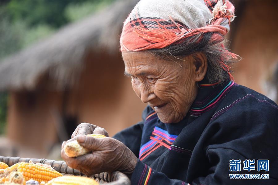 12月3日,在云南省瀾滄拉祜族自治縣南嶺鄉(xiāng)勐炳村龍?zhí)独险?1歲的李娜六老人在老宅前剝玉米。 新華社記者張瑞琪攝