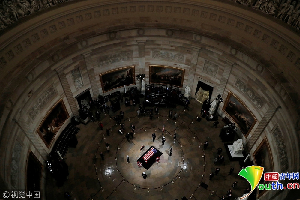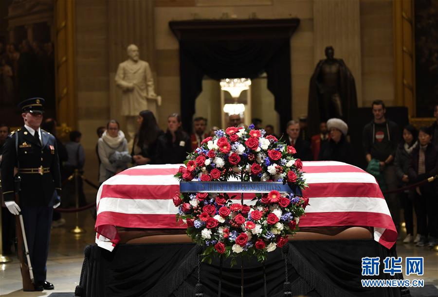 美國前總統(tǒng)老布什的遺體3日下午運(yùn)抵首都華盛頓,安放在國會(huì)大廈圓頂大廳,接受吊唁。