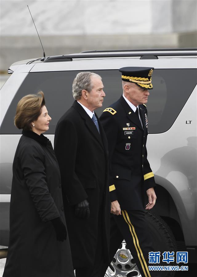12月5日,在美國首都華盛頓,美國前總統(tǒng)喬治·沃克·布什(中)與夫人勞拉(左)抵達(dá)國會(huì)東廣場。