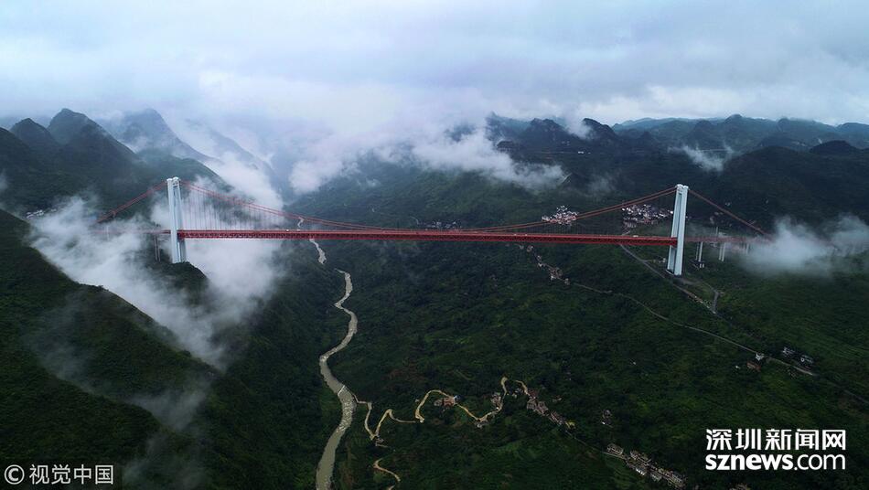 當(dāng)日,杭瑞高速貴州省畢節(jié)至都格(黔滇界)公路北盤江大橋上云霧繚繞,美景如畫。北盤江大橋主橋跨徑720米,橋面到谷底垂直高度565米。