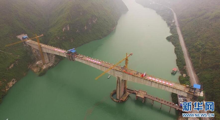 在重慶涪陵拍攝的渝懷鐵路涪秀二線重點(diǎn)工程——烏江右線大橋(10月23日無人機(jī)拍攝)。10月23日,由中鐵四局承建的渝懷鐵路涪秀二線重點(diǎn)工程——烏江右線大橋主跨成功合龍,標(biāo)志著大橋主體工程全部順利結(jié)束。烏江右線大橋項目全程460.1米,主跨192米,跨越烏江和319國道。在兩年多的建設(shè)過程中,施工人員攻克了“不等高墩”“不對稱邊跨”“邊跨入隧”等多個技術(shù)難題。新華社記者王全超攝