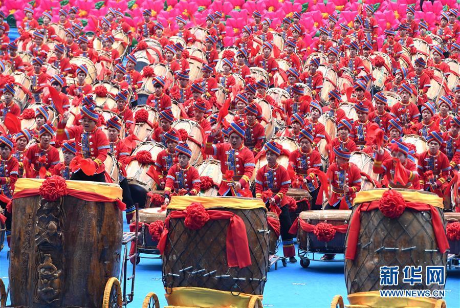 12月10日,廣西壯族自治區(qū)成立60周年慶祝大會(huì)在廣西體育中心隆重舉行。這是慶祝大會(huì)上的群眾文藝表演。 新華社記者 周華 攝